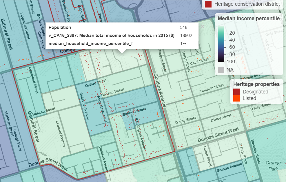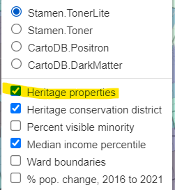tl;dr I created an interactive map map showing heritage properties, and heritage conservation districts overlayed on visible minority composition and neighbourhood median income
