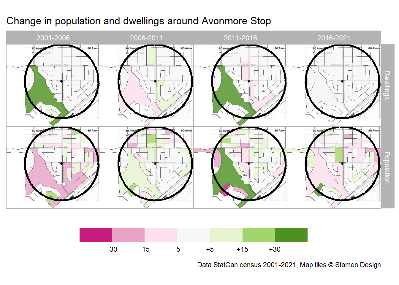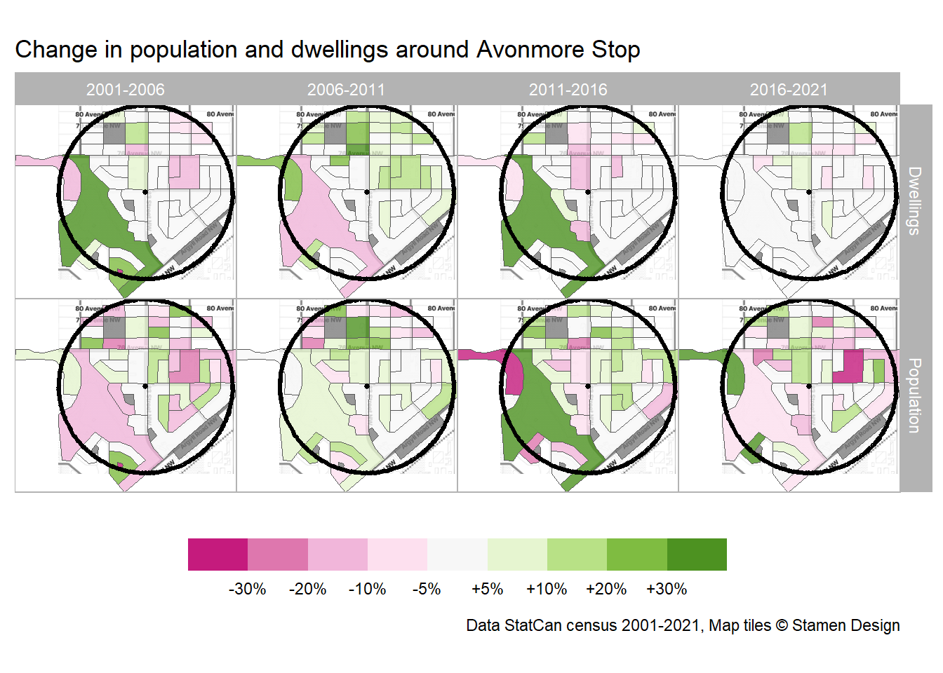 Figure 9: Census-over-census percent change in population and dwellings around Avonmore Stop