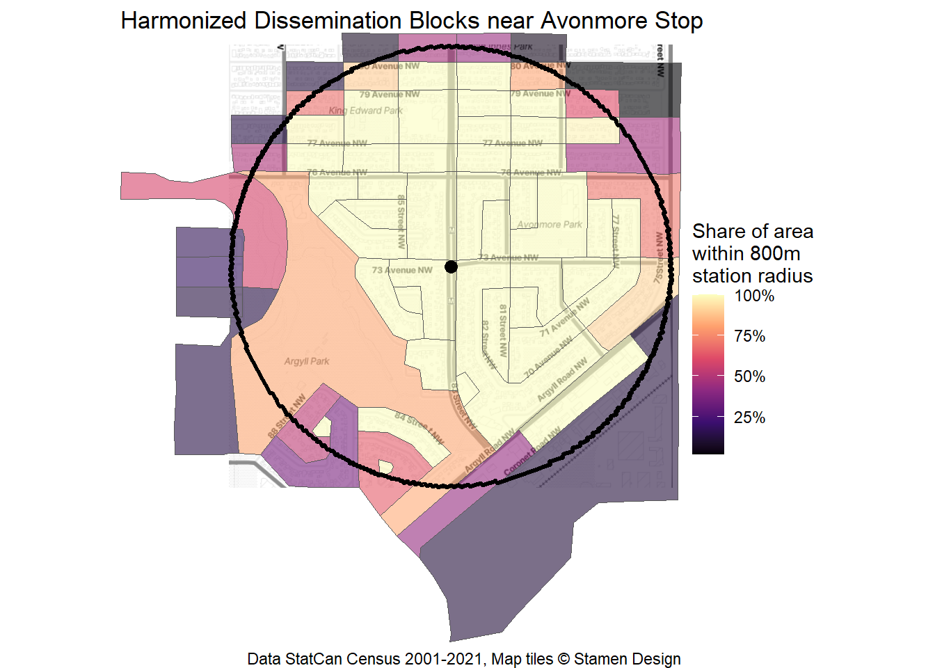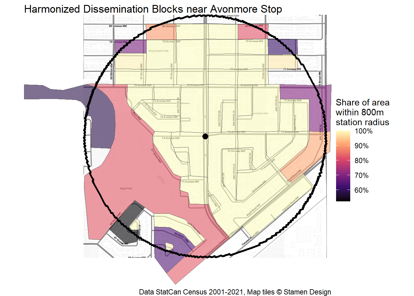 Census data has what we need, but census dissemination blocks (DBs) don’t perfectly line up with the 800m radius and their borders change from census to census. First, I harmonized the 2001-2021 DBs to a common geography using the TongFen library. Then, I selected the DBs that are more than 50% within the station area, shown in Figure 2.