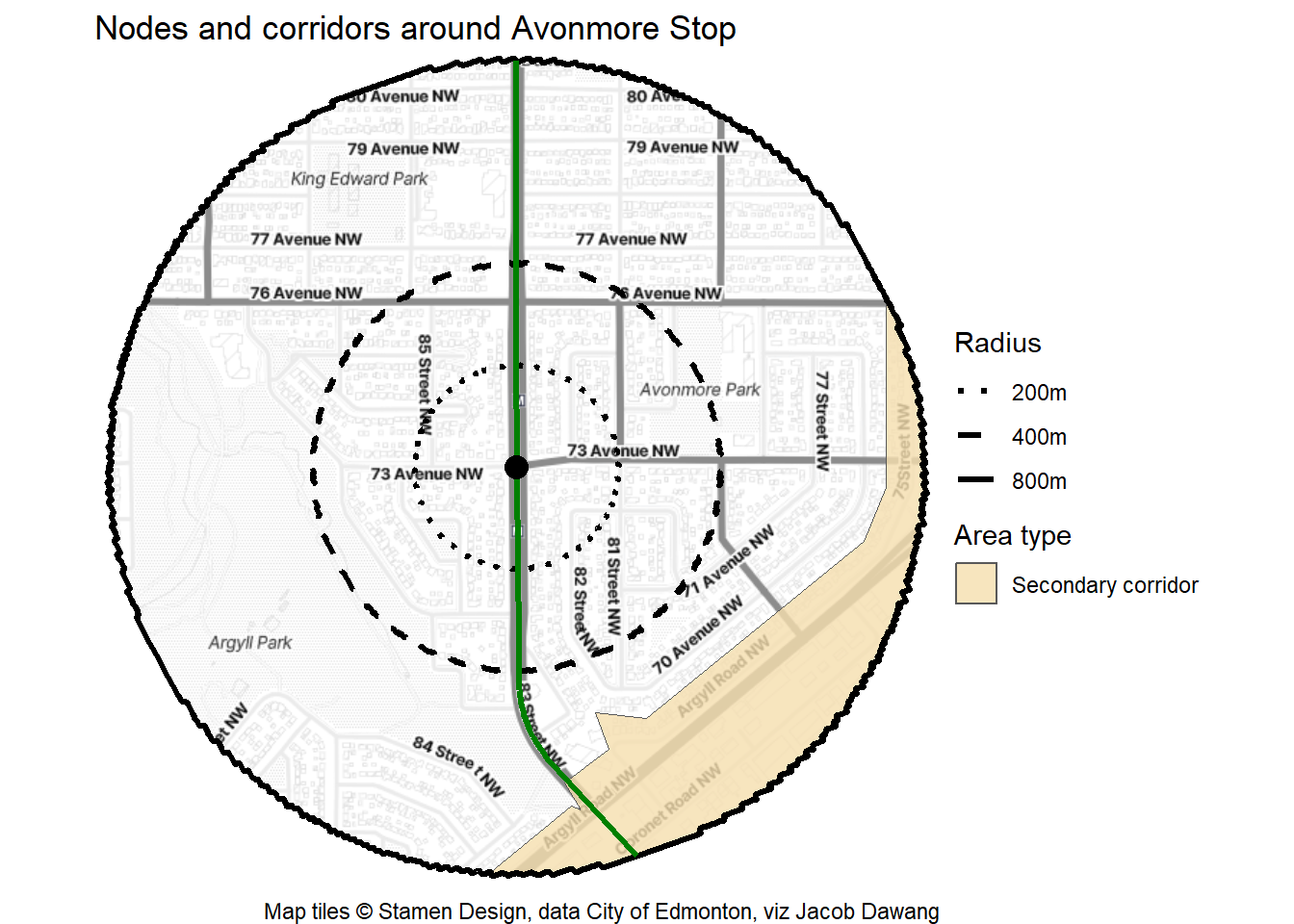 Looking at the nodes and corridors map, we can see that there was no effort to include the LRT station within a node or corridor. Instead, there is a parallel secondary corridor running along 75 St and a bit of Argyll Road to the southeast. That means that only 11% of the station area will be covered by this secondary corridor, which is more of a coincidence than anything.
