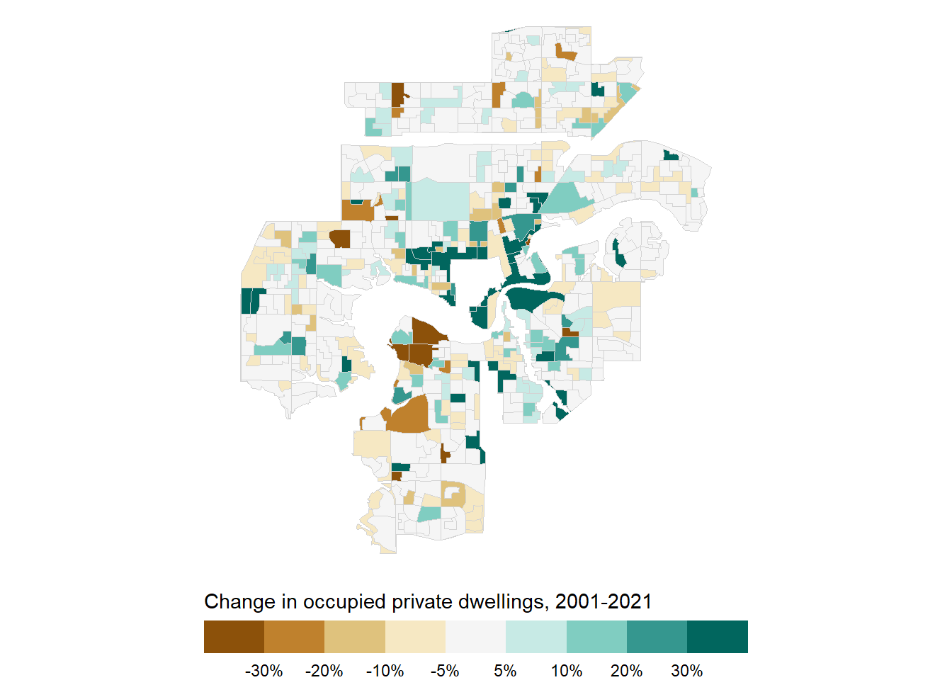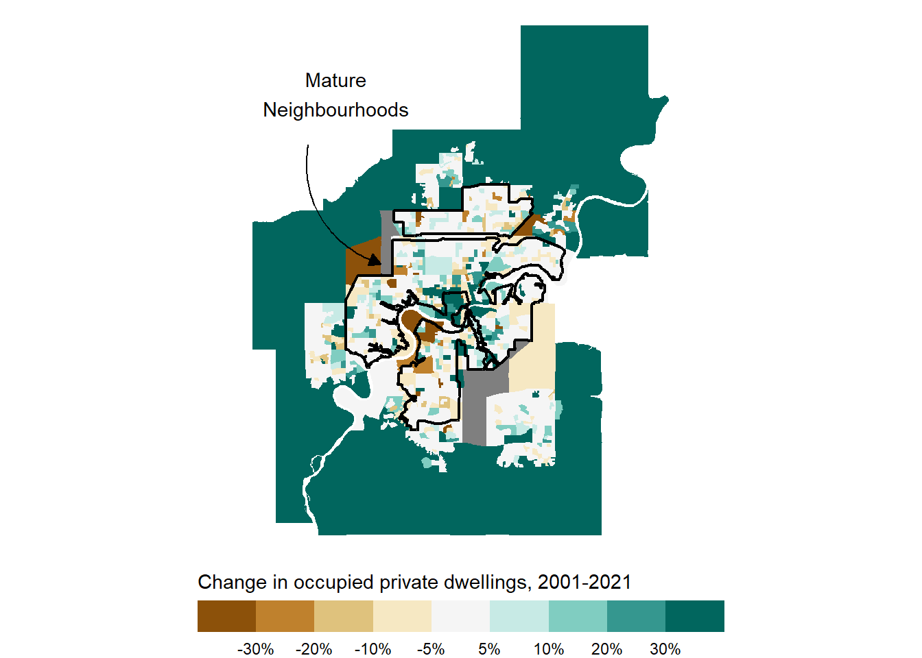 Housing growth mirrors population growth as one would expect. Besides the outer suburbs, housing growth in most areas of Edmonton has stagnated as shown in Figure 3.