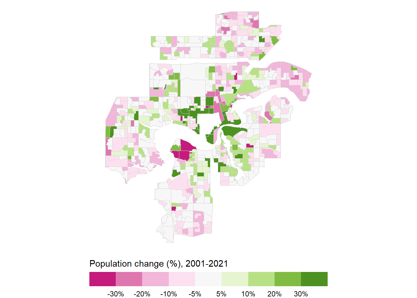 Zooming into the MNO for a closer look in Figure 2, it’s the same story. Neighbourhoods have largely declined in population or remained stagnant. Remember: a 5-10% increase is really nothing compared to 52% growth for the city overall.