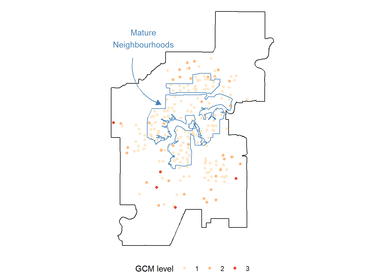 As shown in Figure 5, most schools are at GCM level 1, however, there are far more schools at GCM level 2 and 3 outside mature neighbourhoods than within. Very few schools are above GCM level 1 within mature neighbourhoods.