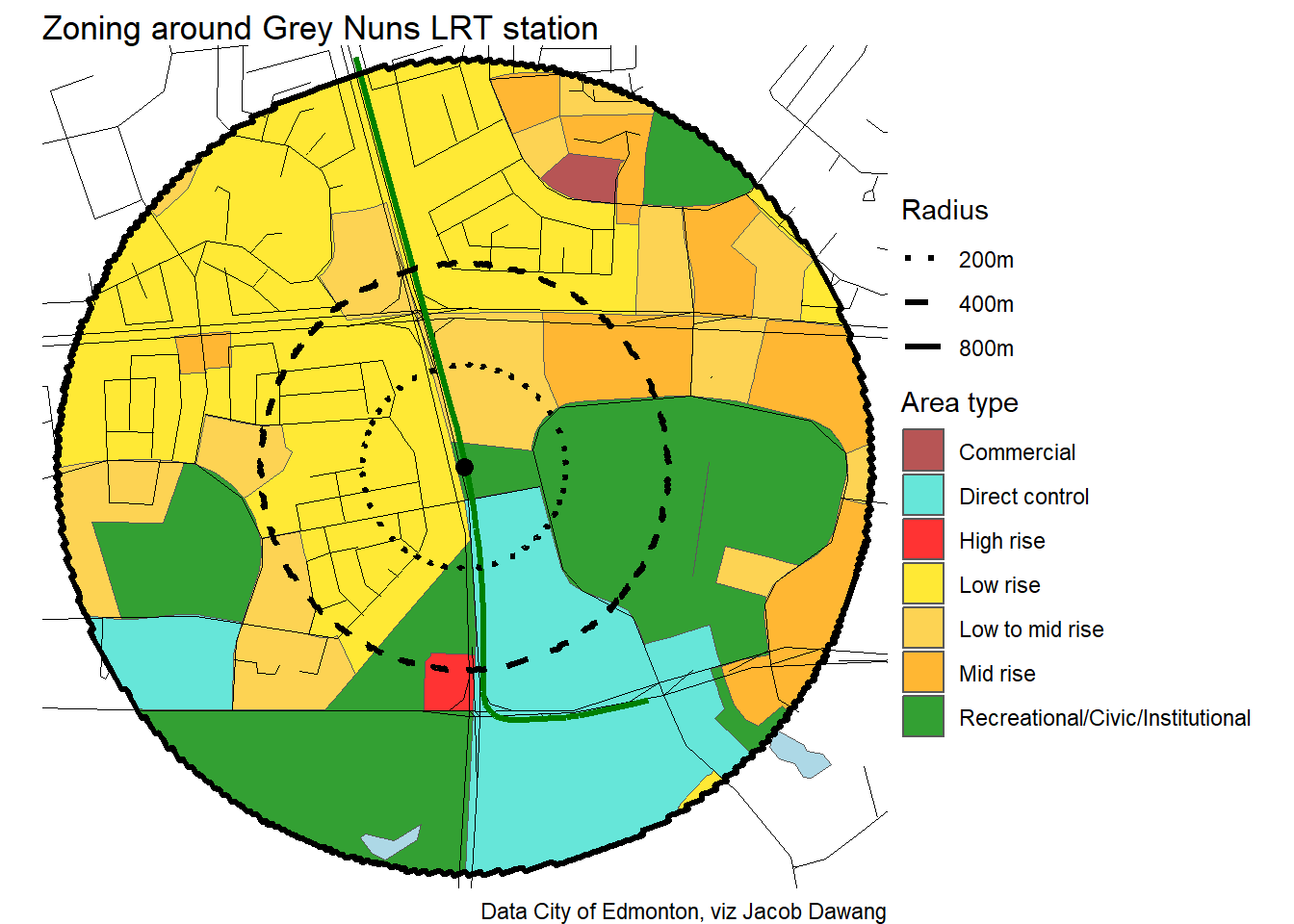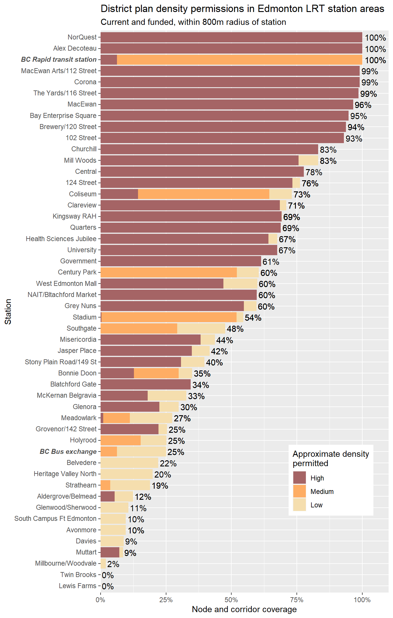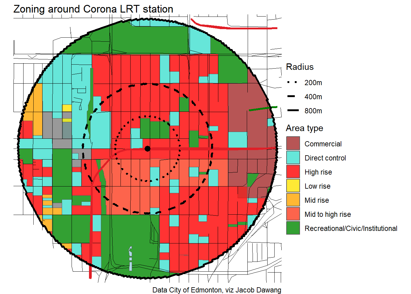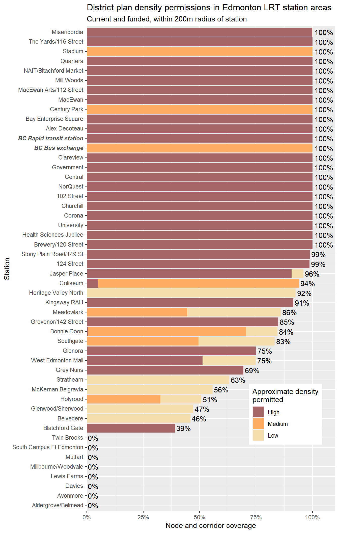 Administration has released the final draft district plans and policy with some minor changes to the policy and minor adjustments to the boundaries of some nodes and corridors. With this, they have also thankfully released open data for the node and corridor boundaries, which makes compiling plots and maps easier. Given this new data, I’m redoing all the charts and maps from my previous post where I looked at what planning permissions district planning would give around Edmonton’s current and funded LRT stations.