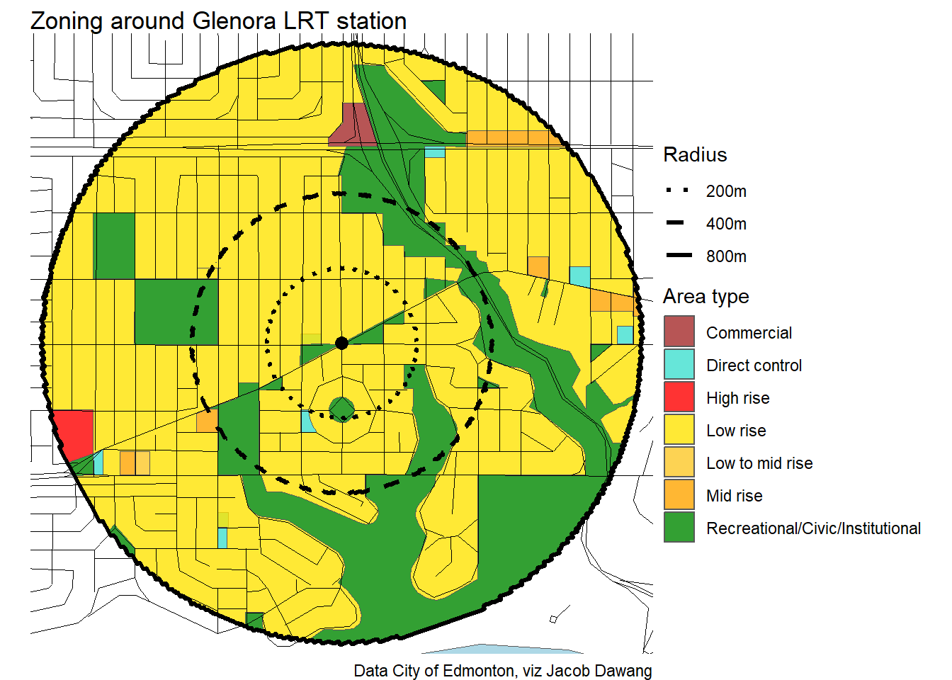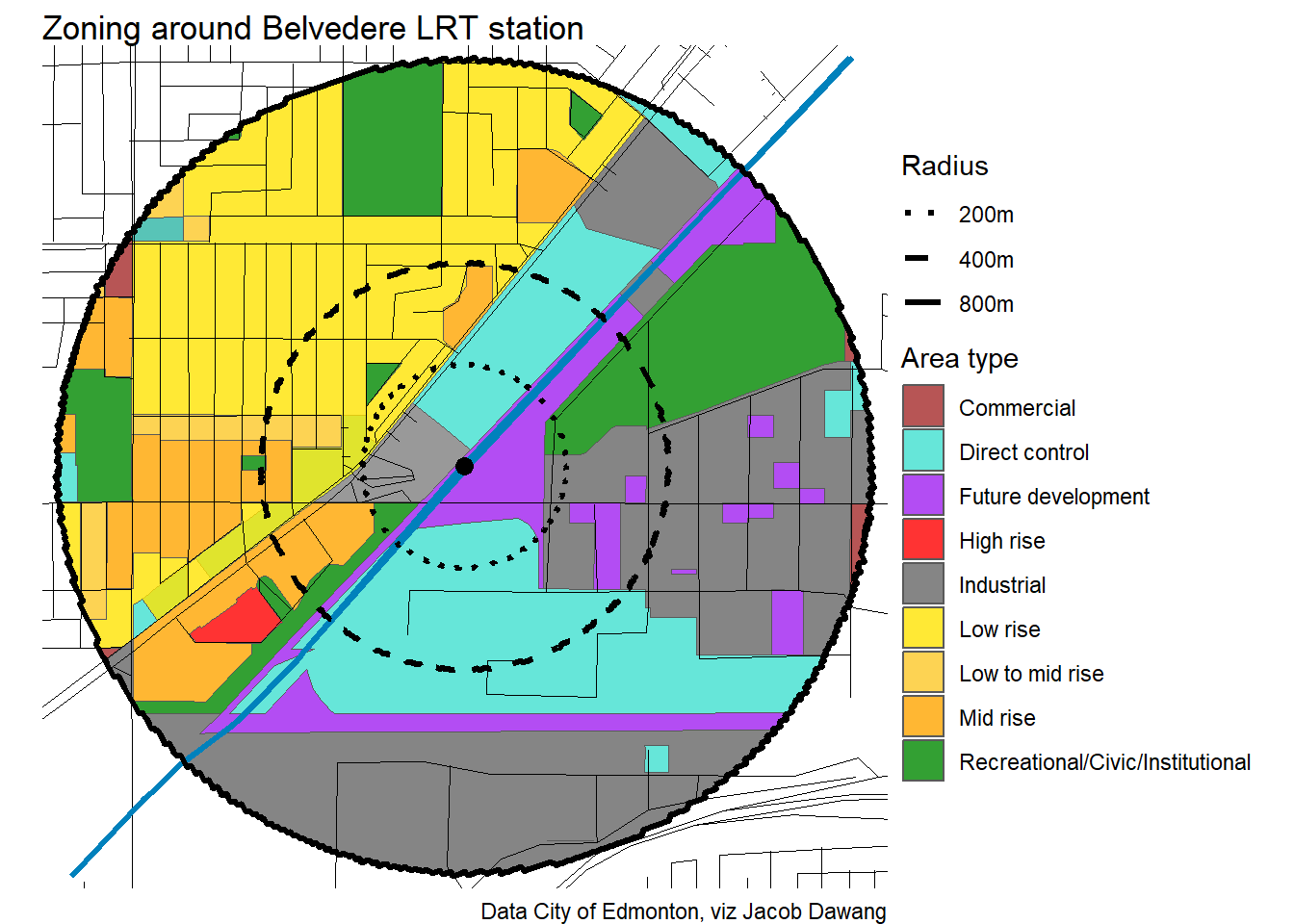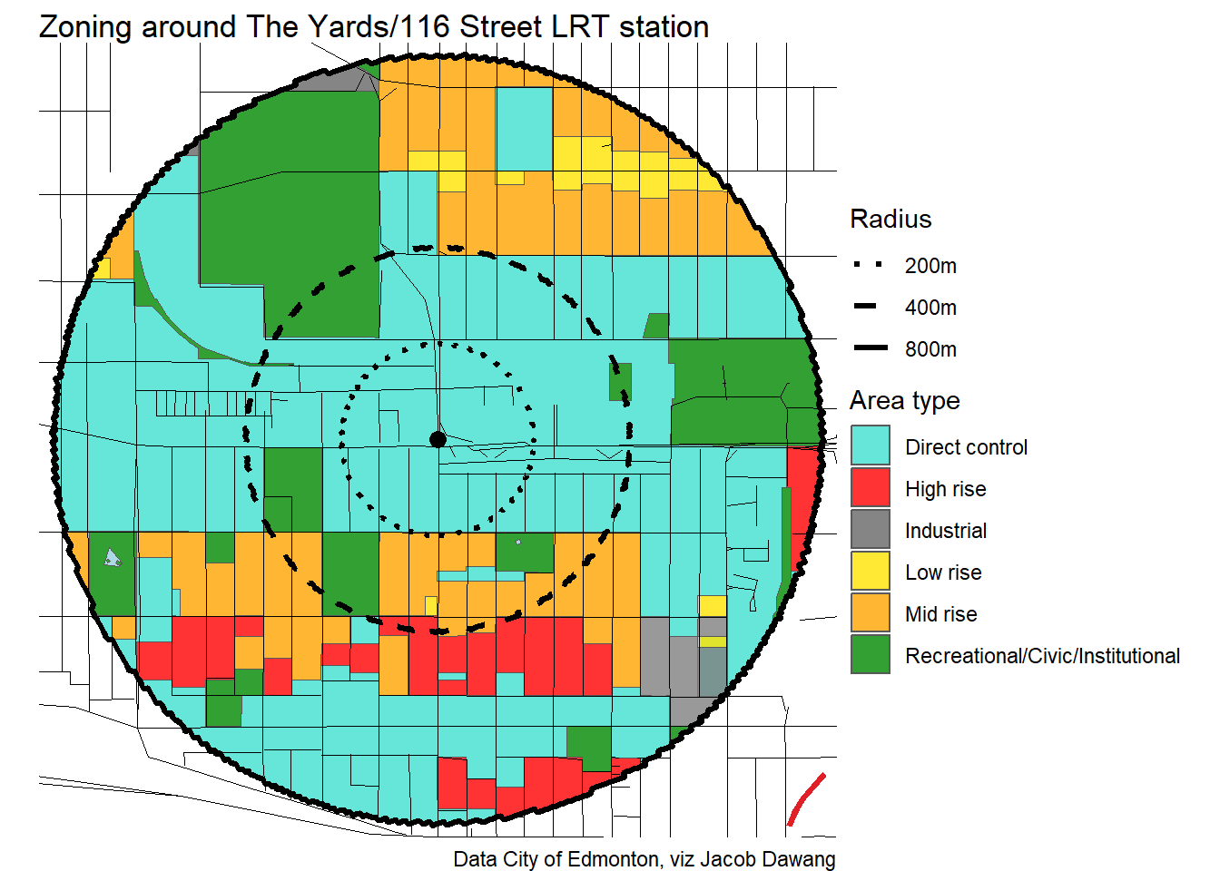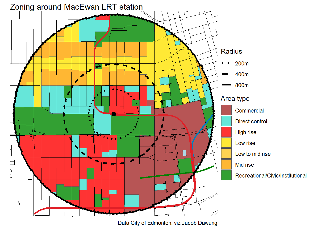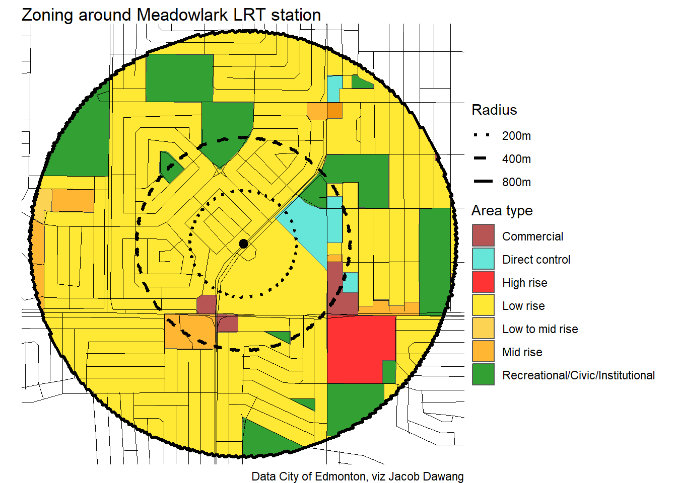 Administration has released the final draft district plans and policy with some minor changes to the policy and minor adjustments to the boundaries of some nodes and corridors. With this, they have also thankfully released open data for the node and corridor boundaries, which makes compiling plots and maps easier. Given this new data, I’m redoing all the charts and maps from my previous post where I looked at what planning permissions district planning would give around Edmonton’s current and funded LRT stations.