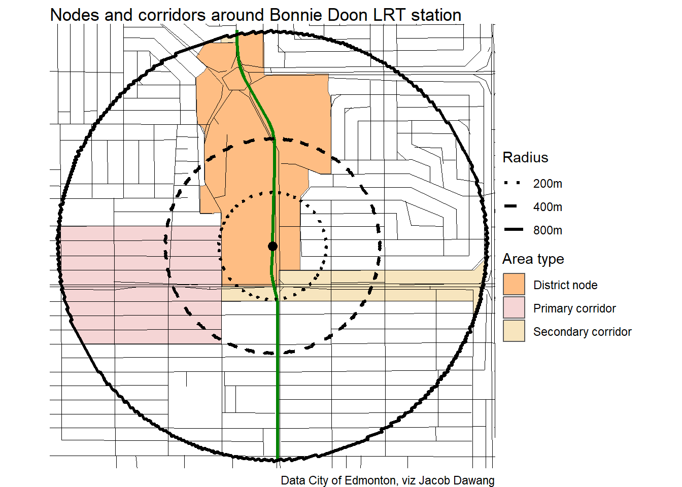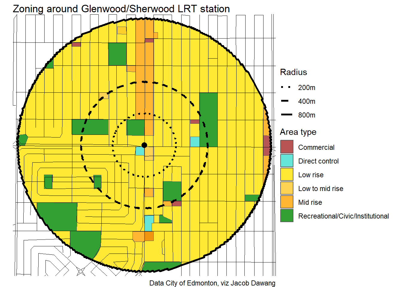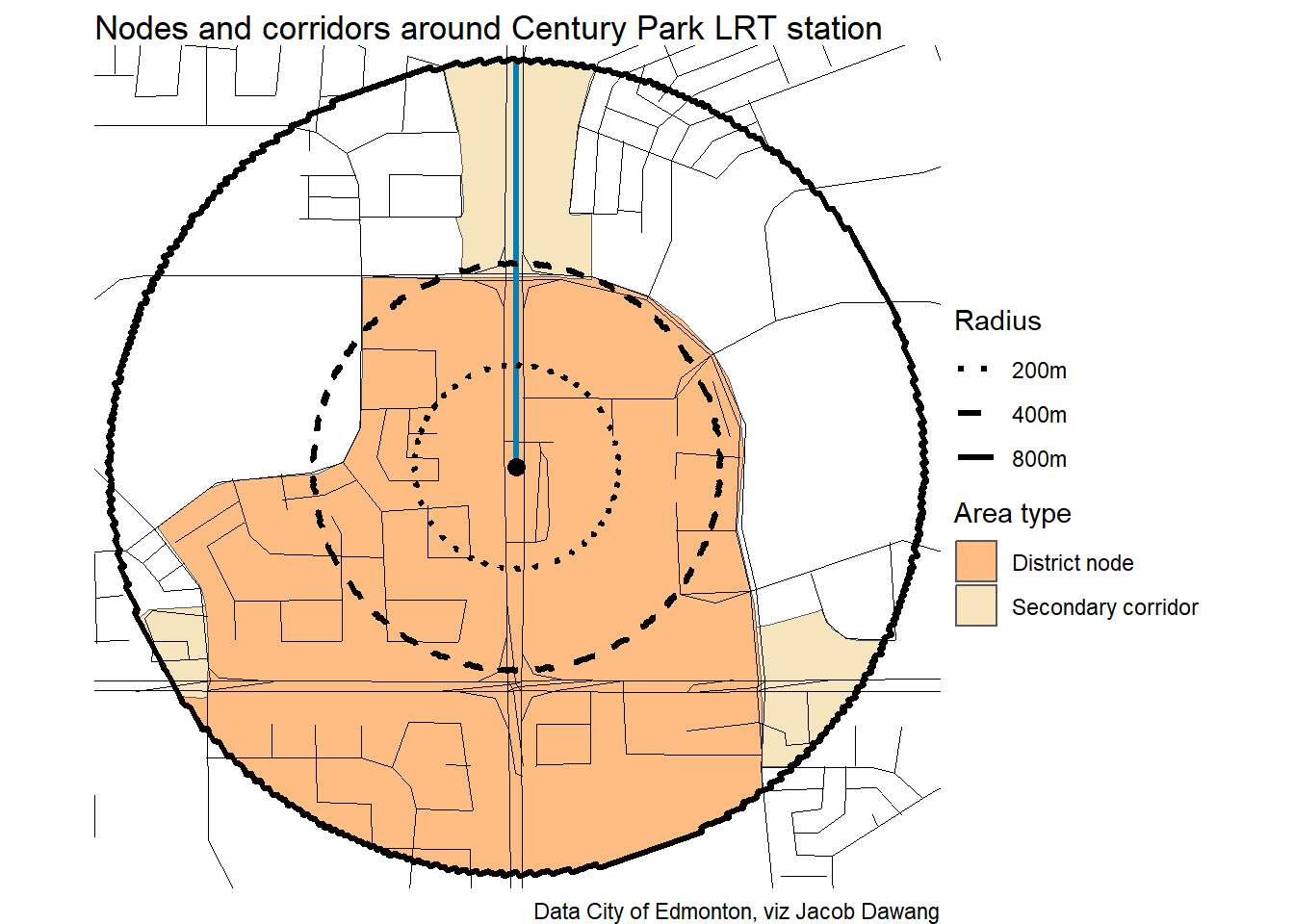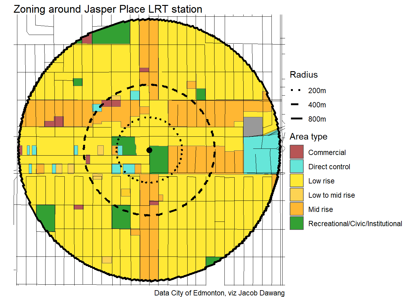 Administration has released the final draft district plans and policy with some minor changes to the policy and minor adjustments to the boundaries of some nodes and corridors. With this, they have also thankfully released open data for the node and corridor boundaries, which makes compiling plots and maps easier. Given this new data, I’m redoing all the charts and maps from my previous post where I looked at what planning permissions district planning would give around Edmonton’s current and funded LRT stations.