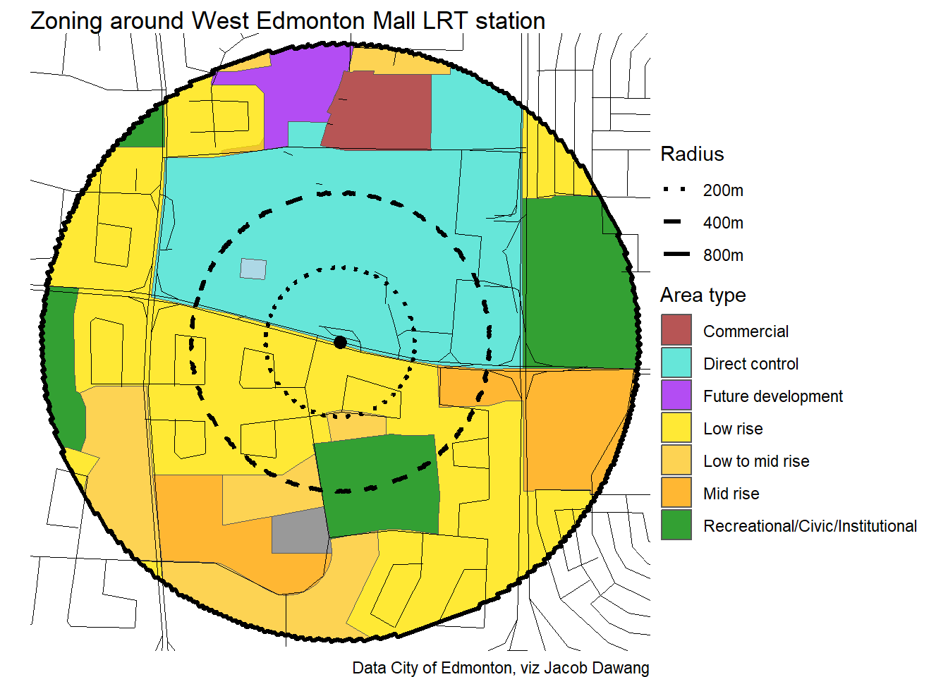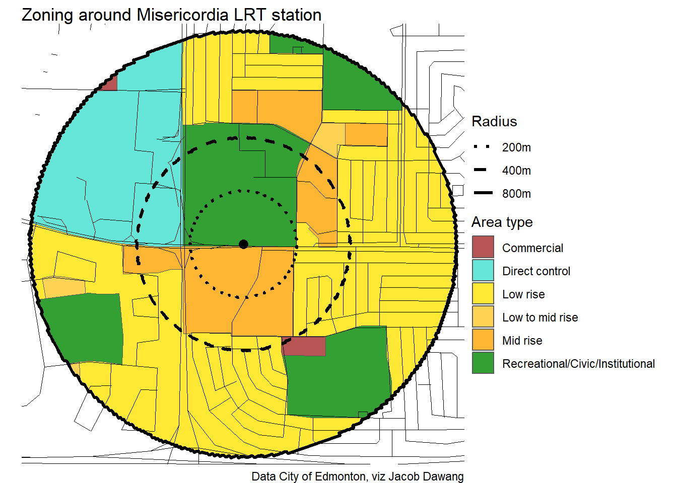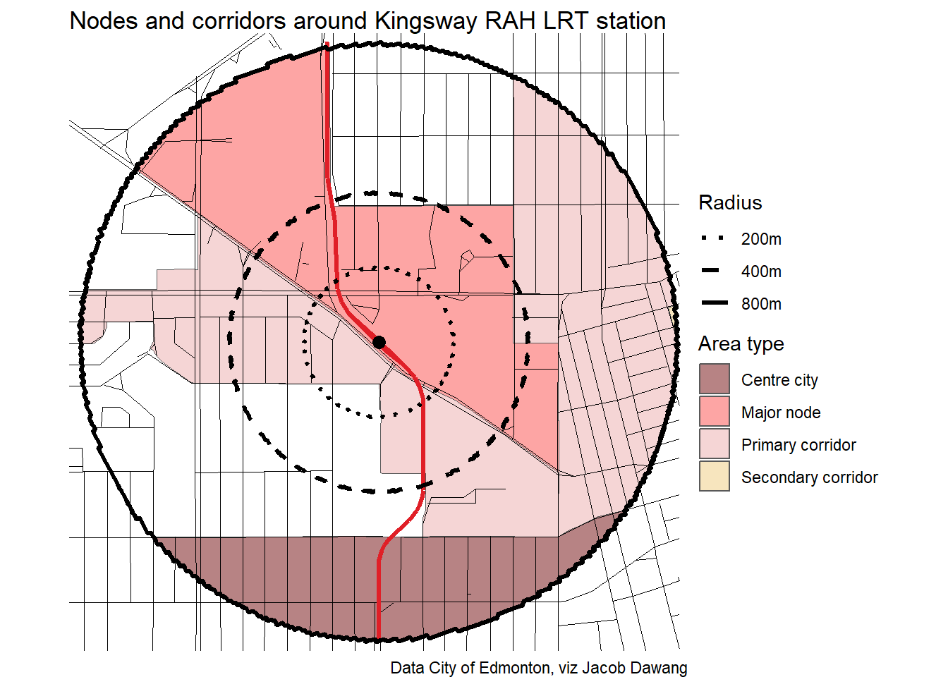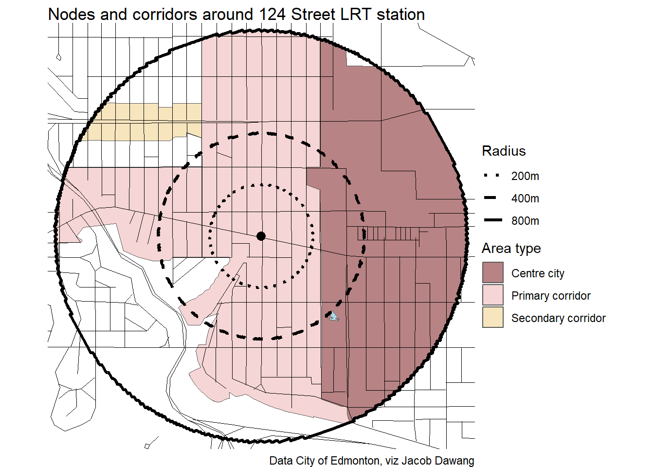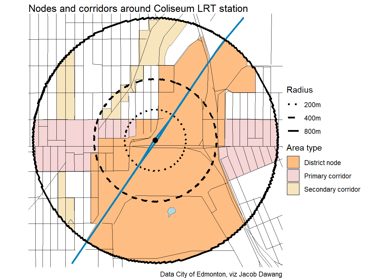 Administration has released the final draft district plans and policy with some minor changes to the policy and minor adjustments to the boundaries of some nodes and corridors. With this, they have also thankfully released open data for the node and corridor boundaries, which makes compiling plots and maps easier. Given this new data, I’m redoing all the charts and maps from my previous post where I looked at what planning permissions district planning would give around Edmonton’s current and funded LRT stations.