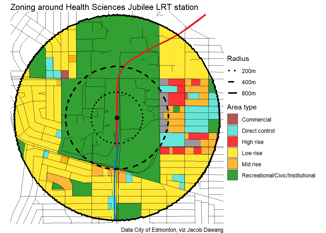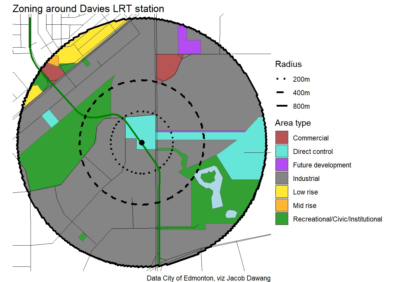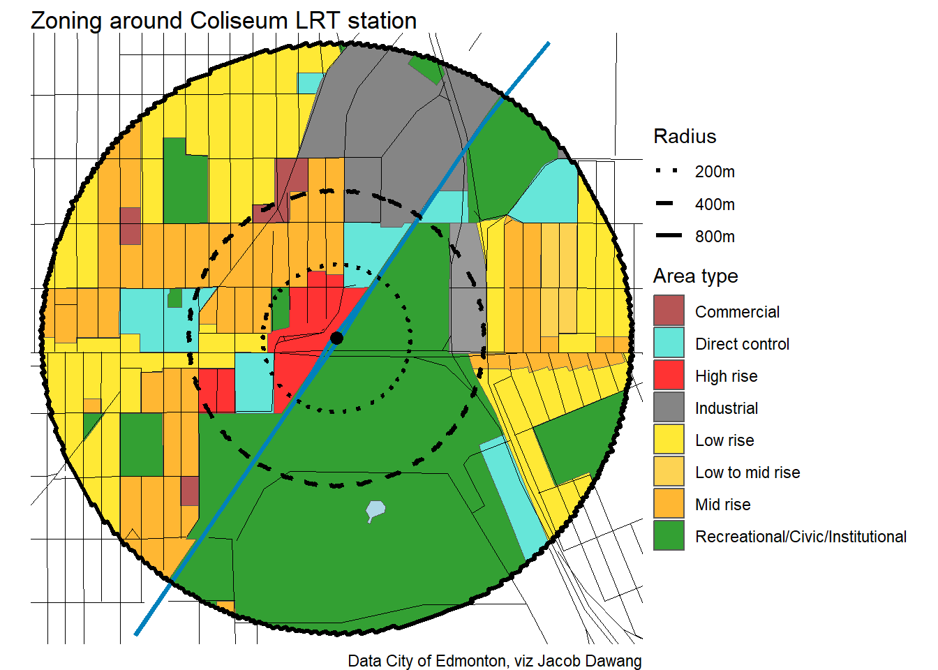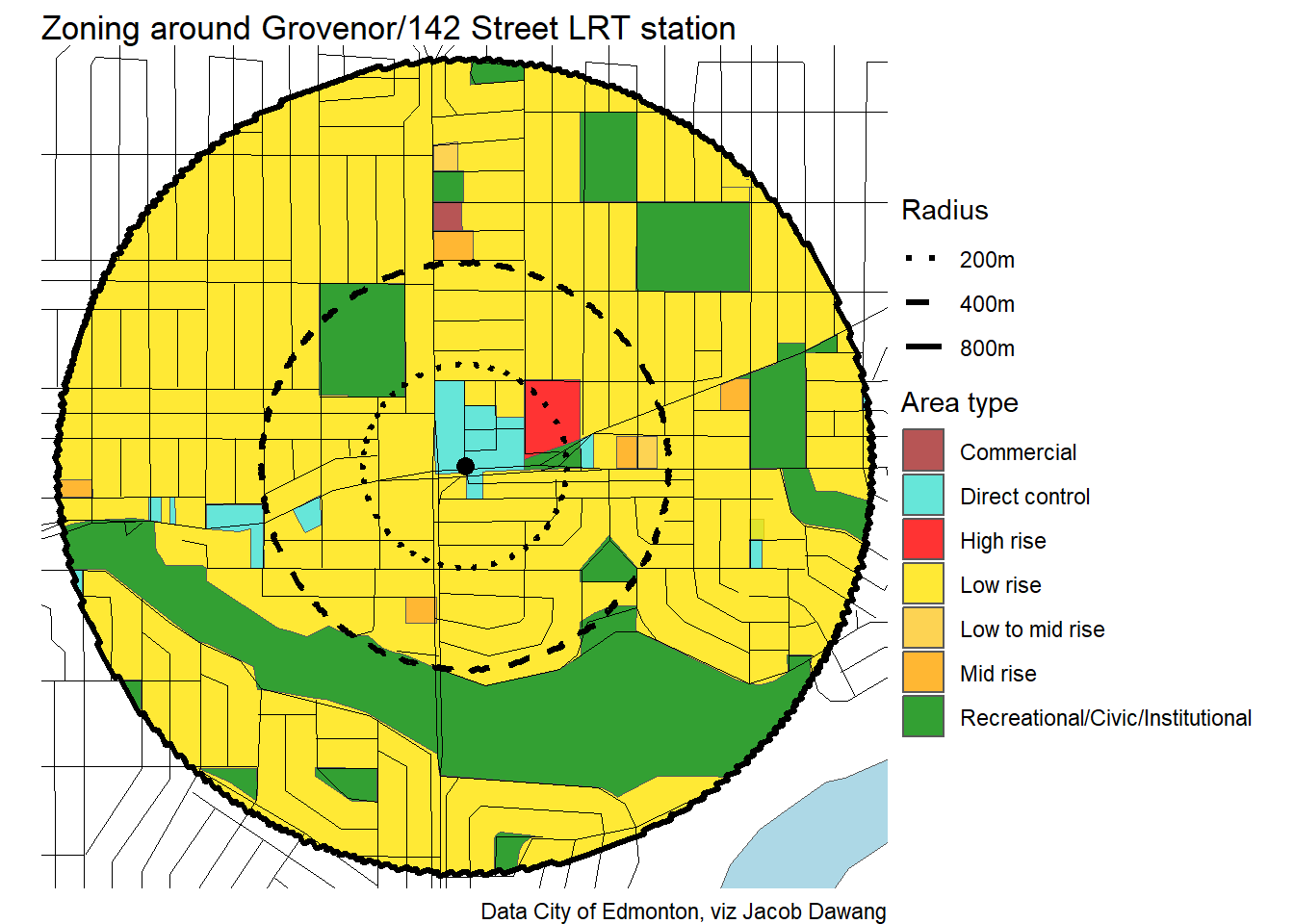 Administration has released the final draft district plans and policy with some minor changes to the policy and minor adjustments to the boundaries of some nodes and corridors. With this, they have also thankfully released open data for the node and corridor boundaries, which makes compiling plots and maps easier. Given this new data, I’m redoing all the charts and maps from my previous post where I looked at what planning permissions district planning would give around Edmonton’s current and funded LRT stations.