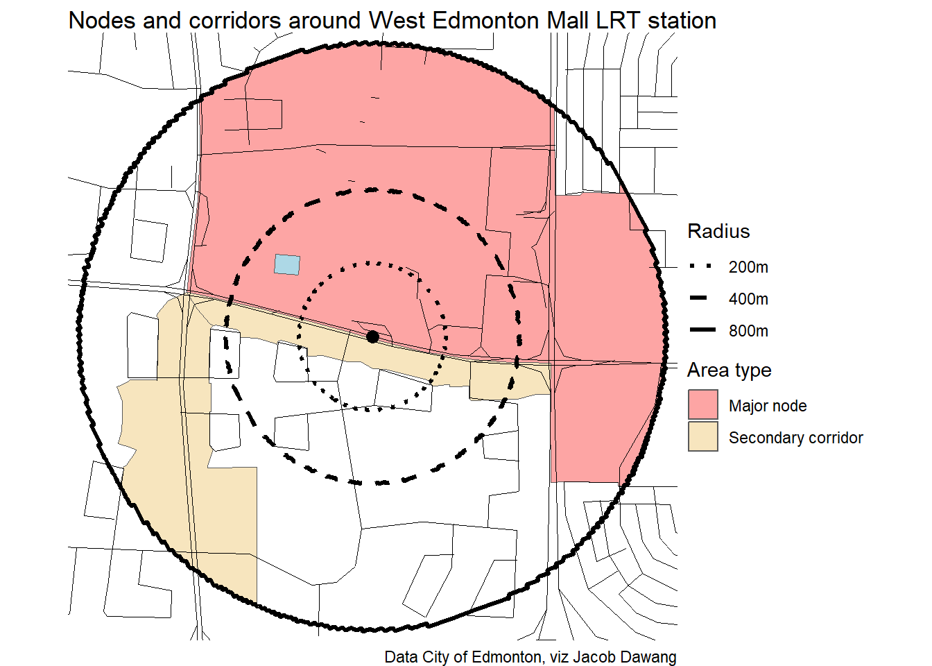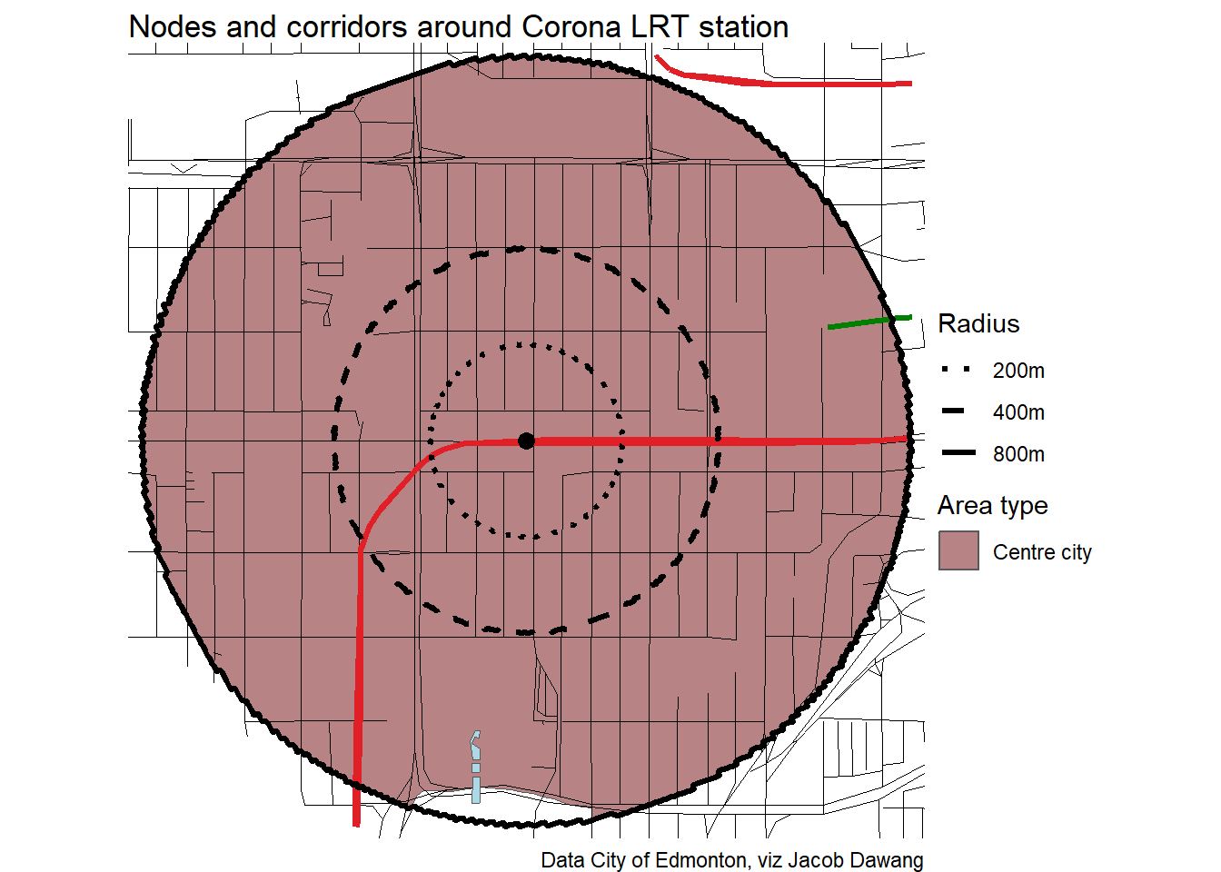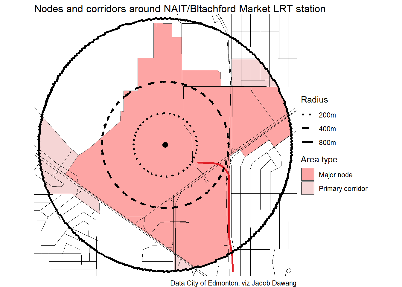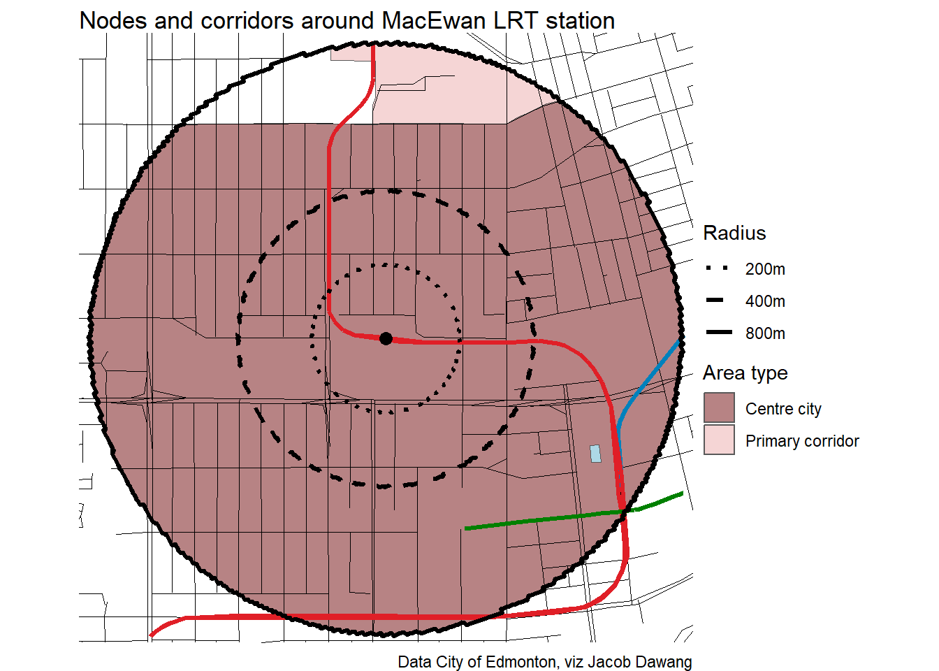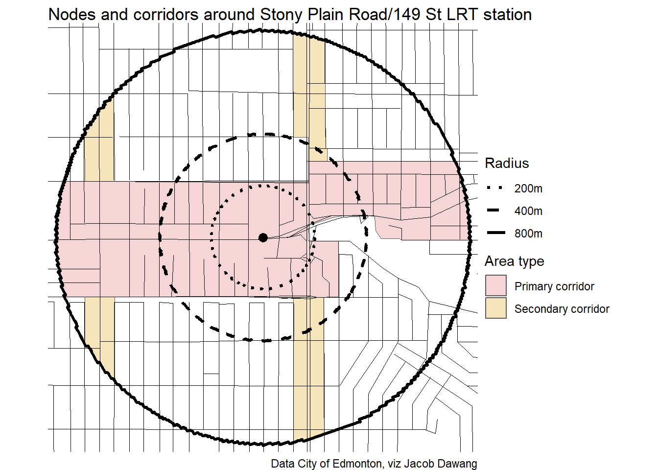 Administration has released the final draft district plans and policy with some minor changes to the policy and minor adjustments to the boundaries of some nodes and corridors. With this, they have also thankfully released open data for the node and corridor boundaries, which makes compiling plots and maps easier. Given this new data, I’m redoing all the charts and maps from my previous post where I looked at what planning permissions district planning would give around Edmonton’s current and funded LRT stations.