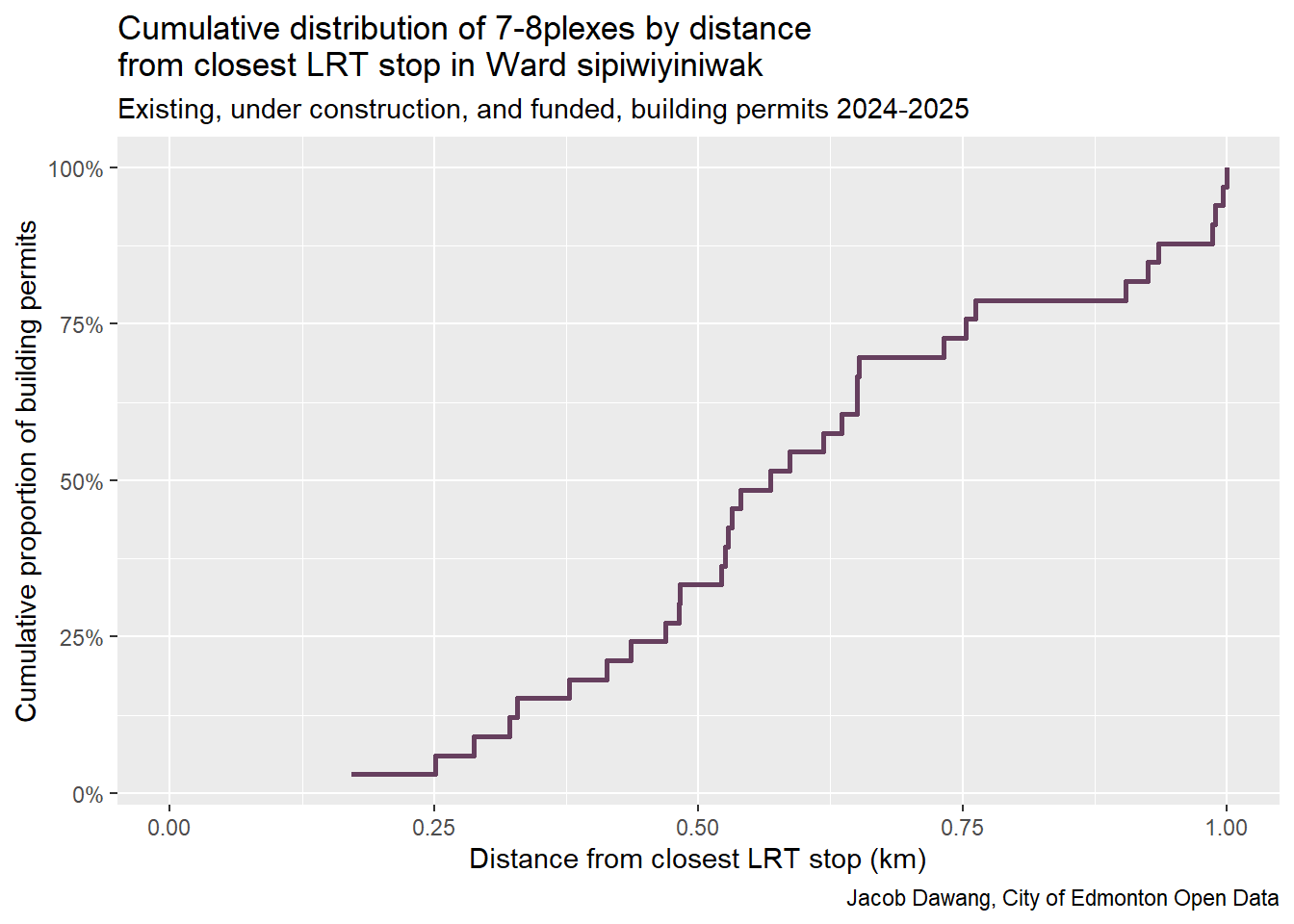To quantify distance from LRT, let’s look at the cumulative distribution of 7-8plexes by distance from LRT. Figure 4 confirms that 7-8plexes are essentially following the Valley Line West. 75% are built within 1km of a LRT stop, 50% are less than 750m away.