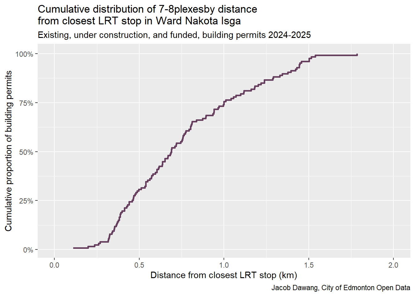 The cumulative distribution plot in Figure 8 confirms that 7-8plexes are built close to LRT, even more than in Ward Nakota Isga. 75% are within 750m and 100% have been built within 1km.