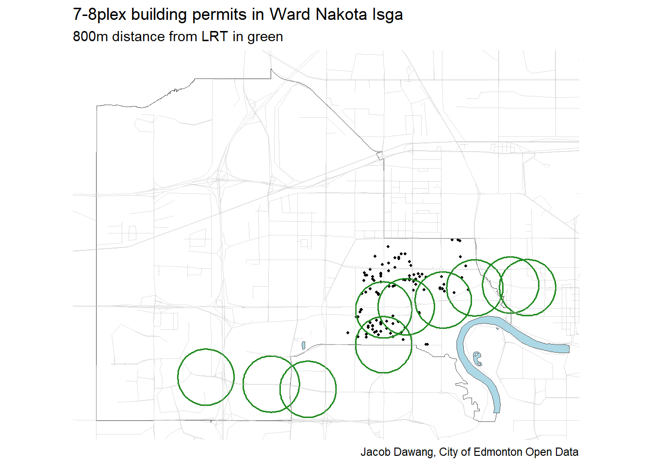 It’s impossible to talk about infill in Ward Nakota Isga without talking about the Valley Line West LRT. Figure 3 shows a clear relation between the path of the LRT and where 7-8plexes are being built.