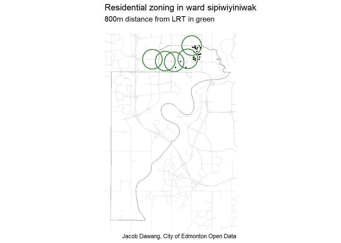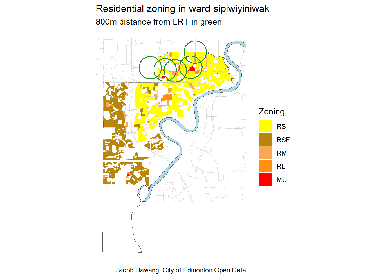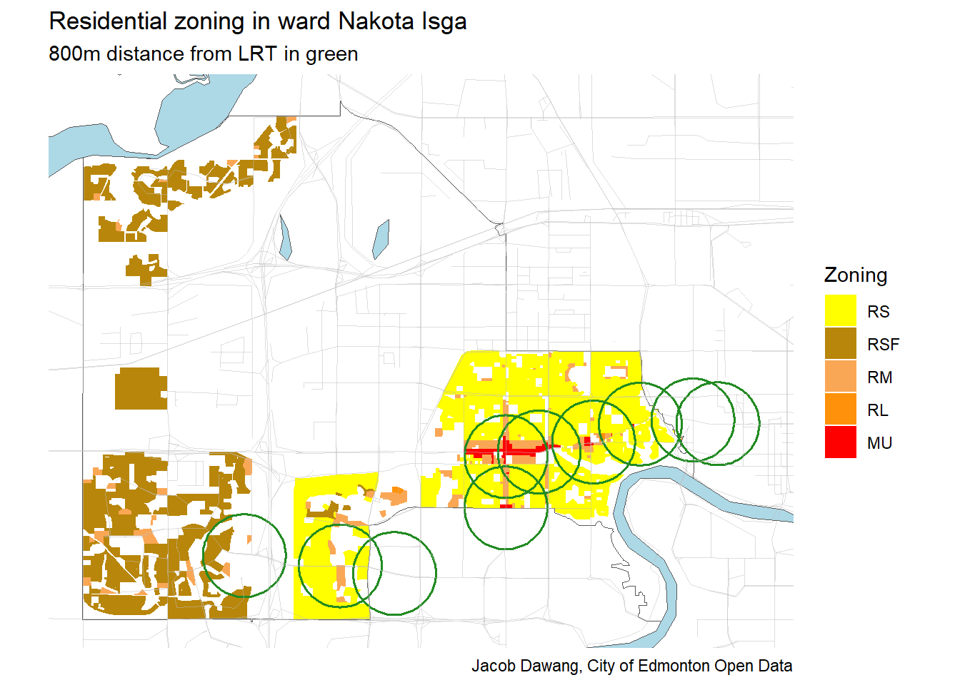 Figure 2 shows that a lot of the ward is zoned RS. But, also a huge proportion of the RS-zoned land is within 800m walking distance of LRT, as shown by the green circles in the image.